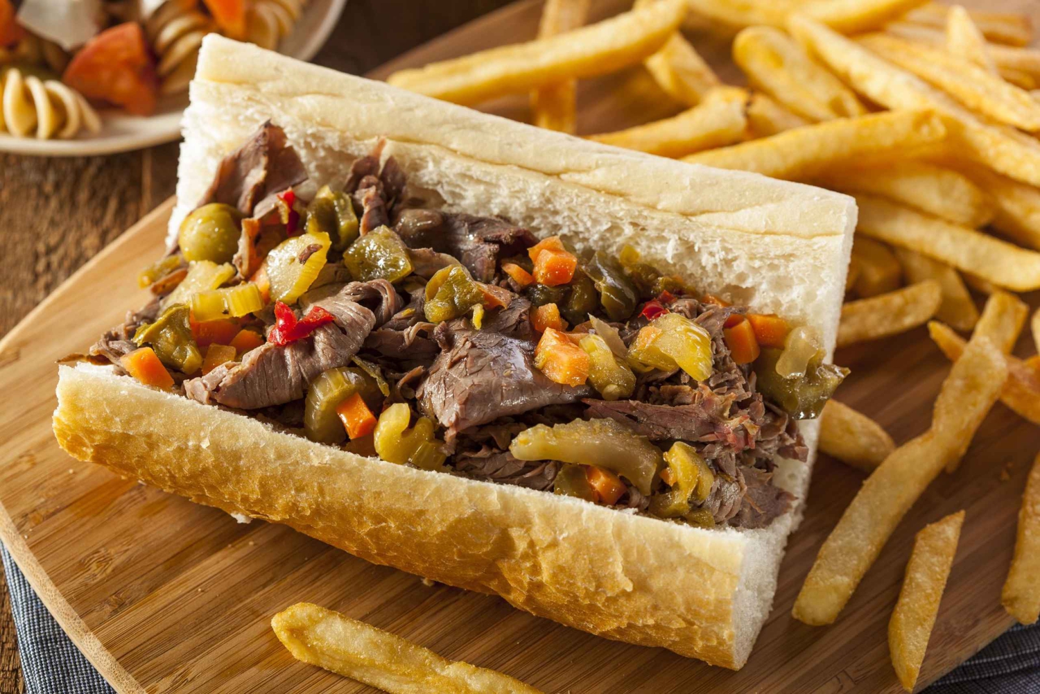 - Pizza estilo Chicago, perritos calientes, carne italiana y brownies