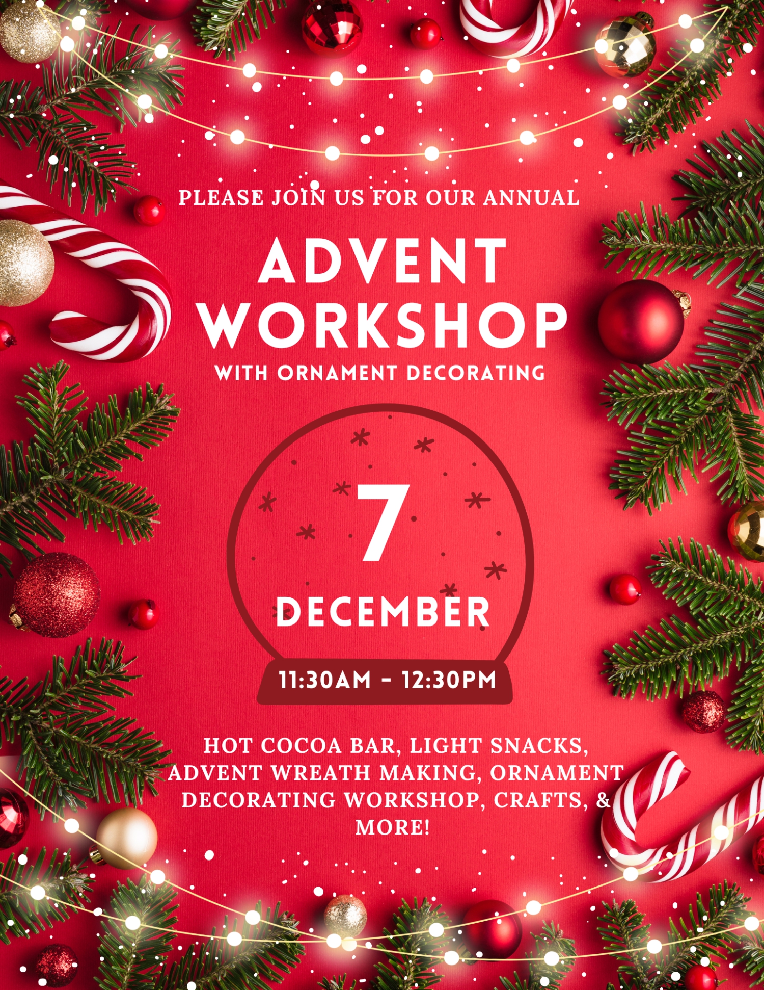 Celebrate the season of anticipation and joy with our Advent Workshop—a festive gathering for all ages! This hands-on event is a wonderful way to prepare our hearts and homes for Christmas through creativity, community, and reflection. Join us for an afternoon filled with seasonal activities, including: 🎨 Ornament Decorating – Create keepsakes to cherish or share 🕯️ Advent Wreath Making – Assemble a meaningful symbol of the season ✂️ Craft Stations – Explore a variety of creative projects for kids and adults ☕🍪 Hot Cocoa Bar & Light Snacks – Enjoy warm treats and good company ✨ And More! – Surprises and special touches to make the day memorable Whether you’re new to Advent traditions or have celebrated for years, this workshop offers a joyful space to slow down, connect, and embrace the meaning of the season. All are welcome—bring your family, invite a friend, and come ready to create and celebrate!