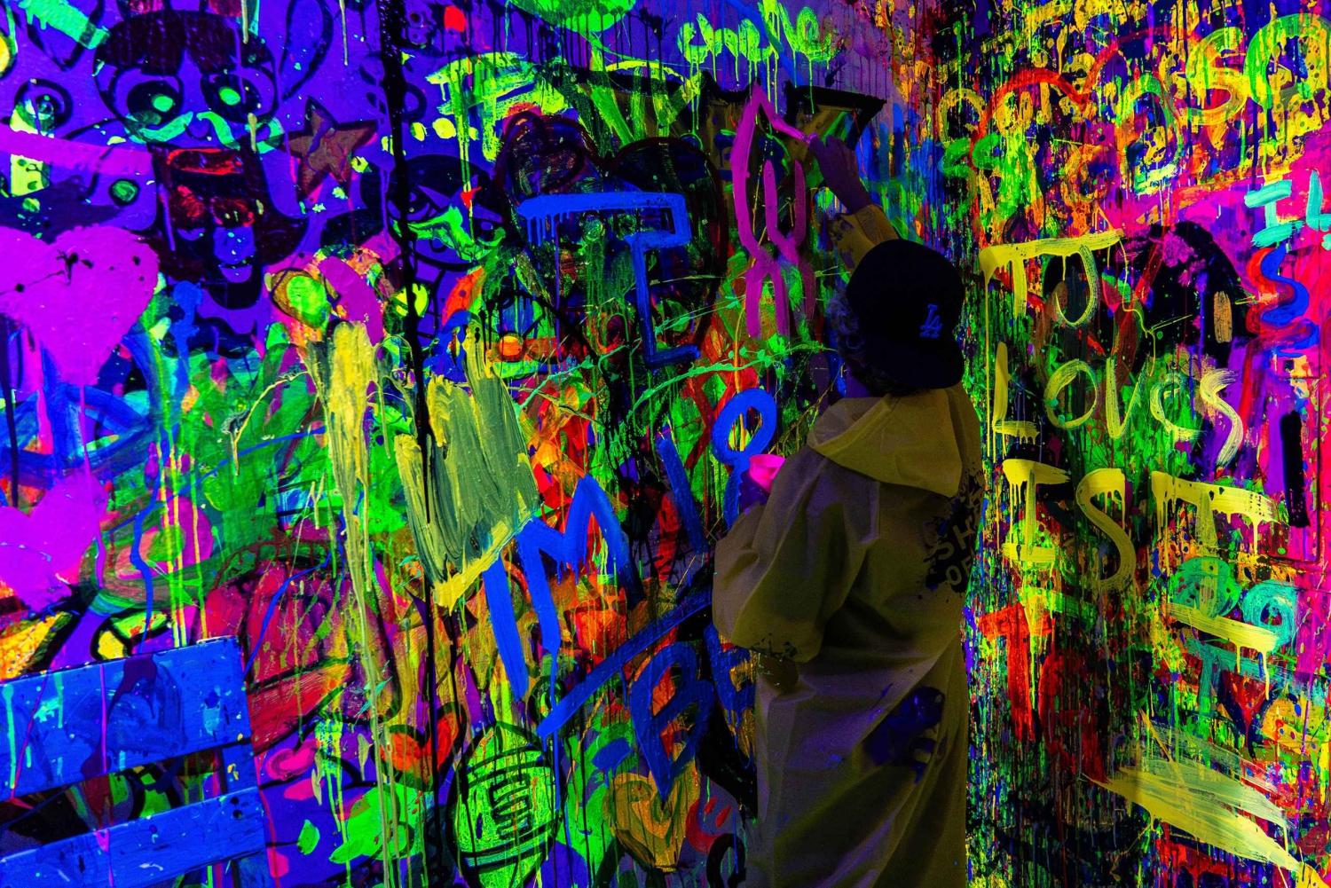 - Watch as fluorescent paint bursts onto the canvas, creating vibrant patterns